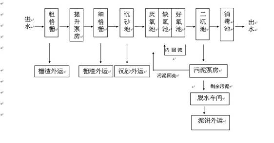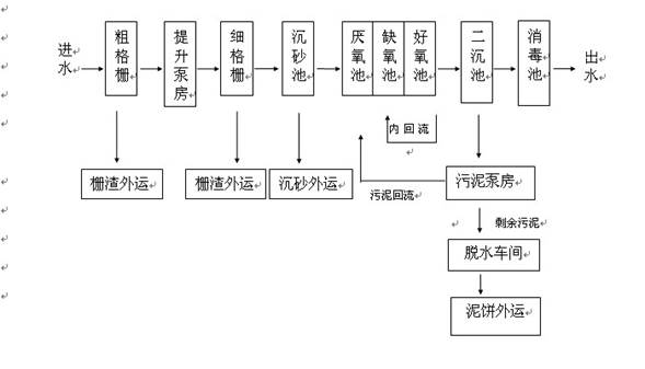 主要生產設備:粗格柵、潛水泵、細格柵、沉砂機、鼓風機、微孔曝氣器、推流器、刮吸泥機、二氧化氯發(fā)生器、帶式污泥濃縮脫水機。