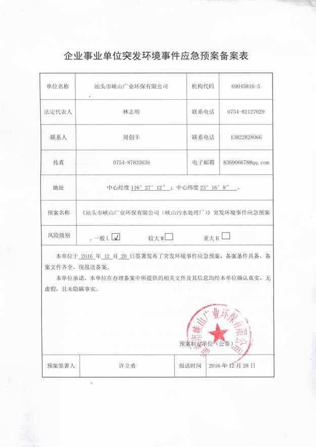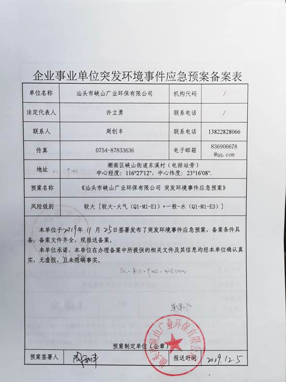 汕頭市峽山廣業(yè)環(huán)保有限公司根據(jù)自身實際情況制定了突發(fā)環(huán)境事件應急預案,并成立了環(huán)境污染突發(fā)事件應急處理領導小組,根據(jù)制定的應急預案定期開展應急演習,以確保做到對突發(fā)環(huán)境事件反應快速,救援及時,應對措施得力有效,保障社會穩(wěn)定、人民生命財產和生態(tài)環(huán)境安全,保證企業(yè)安全生產和經濟效益的提高。